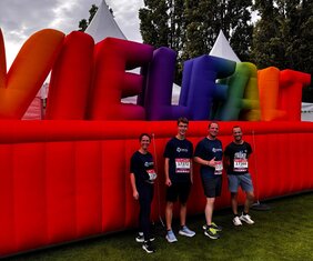 Ähnlich erging es den Läufer*innen von ID bei der erstmaligen Teilnahme am B2Run in Köln, der mit über 20.000 Teilnehmenden aus 851 Firmen rekordverdächtig war. Jennifer Krings, Marc Barth, John Weigandt und Neuzugang Moritz Hedrich verabredeten sich nach Feierabend und fuhren nach Köln. Dort stand der diesjährige B2Run unter dem Titel „Vielfalt“ als gemeinsames Event auf dem Programm. Es galt zwar das olympische Motto, doch ein bisschen Ehrgeiz war auch dabei. Mit 35 Minuten und 45 Sekunden liefen die Vier nach 6 Kilometern ins Ziel. Auch für dieses Team steht fest, dass sie nächstes Jahr wieder dabei sind.